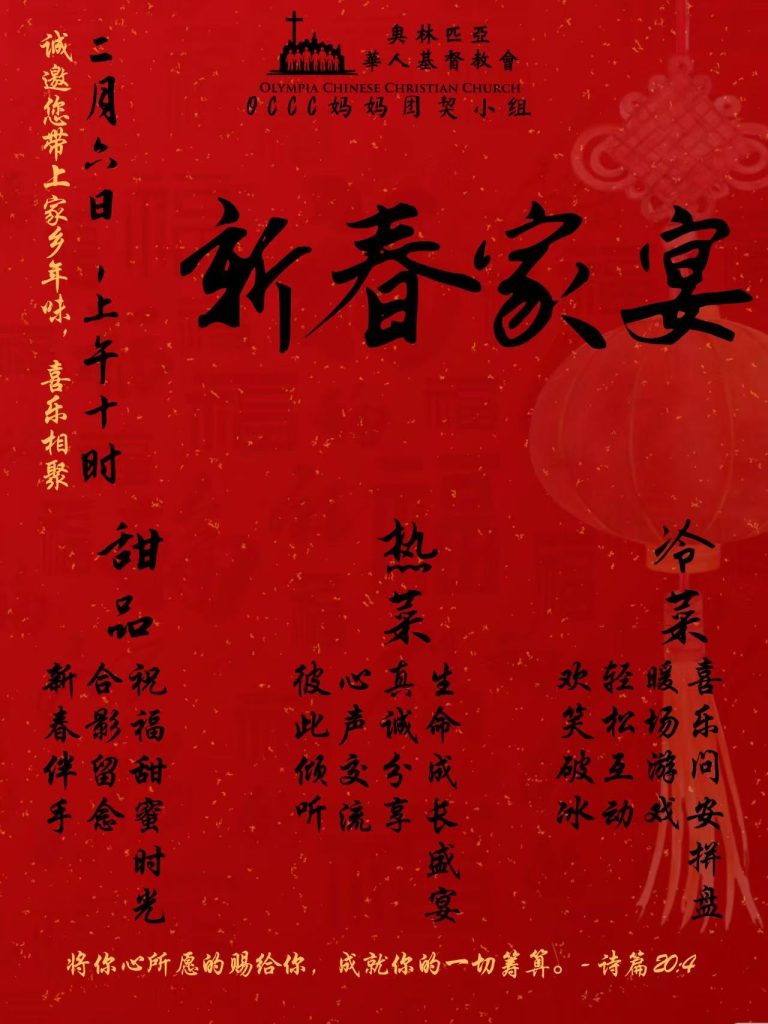 ♦♦ OCCC 2024年的目标 (Our Goals) ♦♦ (1).  读/听完一遍整卷圣经或者旧约或者新约加诗篇一遍 (Read/listen to the entire Bible once or OT or NT plus Psalms once);我们会利用读经软件激励帮助弟兄姐妹读经. (2). 访问一个你尚未关心过的OCCC家庭/个人 (Visit one family/person of OCCC that you have yet to visit). (3). 教会是建在山上的城,天父的儿女是放在台上的灯。神把OCCC放在奥林匹亚地区,我们应当在自己周围发挥光和盐的作用(太 5:13-15),履行大使命、传扬福音、播洒主爱、为主作美好的见证(太 28:18-20)。在2024新的一年里,愿每一位OCCC的弟兄姐妹为着主的名去关心身边的一位或者一家朋友,主动联络并邀请他们来教会;为他们祷告,求主做工让他们接受耶稣基督成为他们生命的救主,得到人生最美的祝福。
