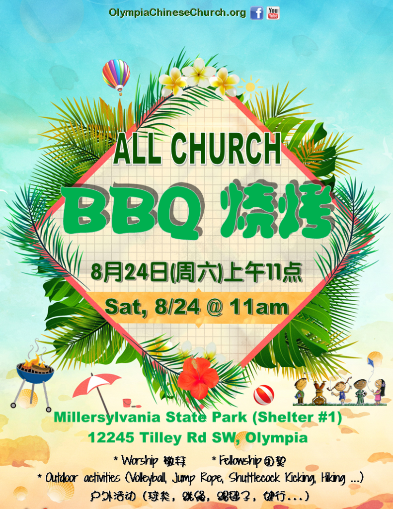 Please join us at 11:00am on Saturday, August 24th in Millersylvania State Park (Shelter #1) for OCCC 2019 Summer All Church BBQ! This is a great time to fellowship while having some fun. There will be lots of delicious food and a variety of outdoor activities to choose from. You are encouraged to bring friends.